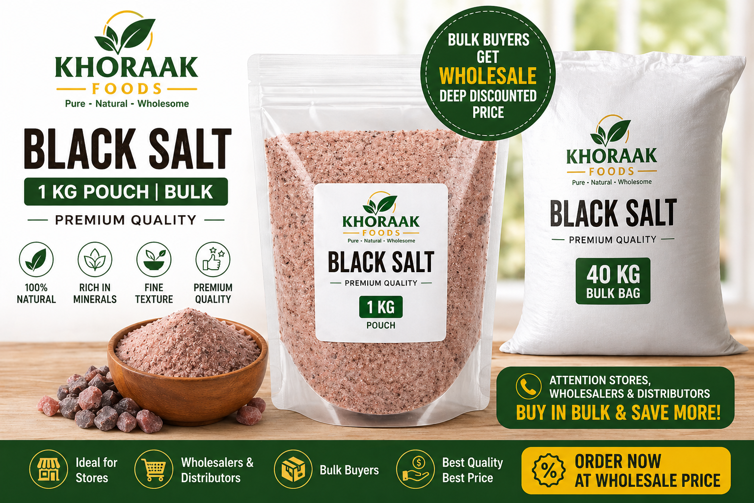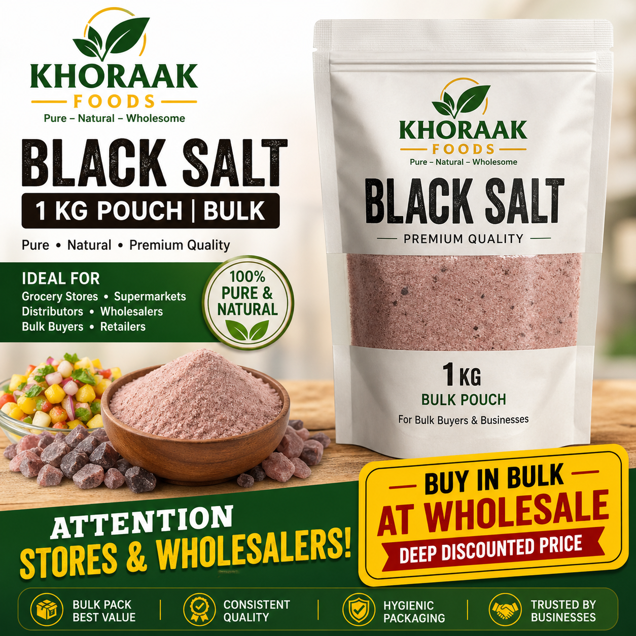 Premium Black Salt Bulk wholesale (Kala Namak) by Khoraak Foods is ideal for grocery stores, restaurants, hotels, and wholesalers in Pakistan.