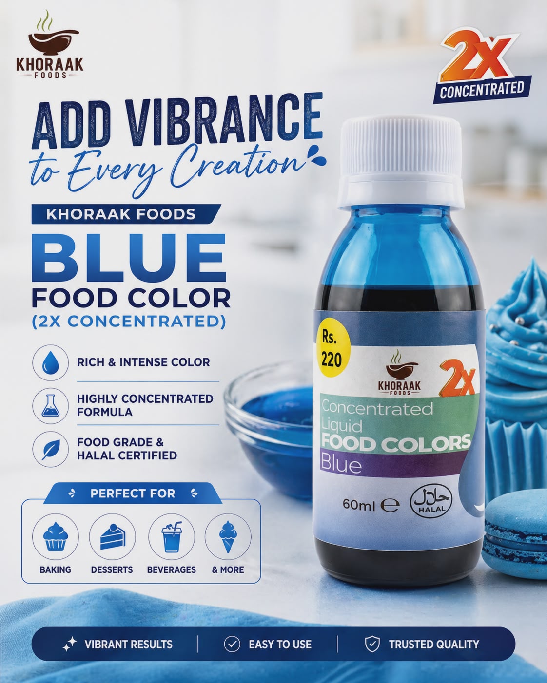 Khoraak Foods ensures quality and consistency. Because of strict standards, this blue food color maintains strong pigmentation and purity. In addition, it provides reliable performance in all recipes. As a result, it becomes a trusted choice for cooking and baking.