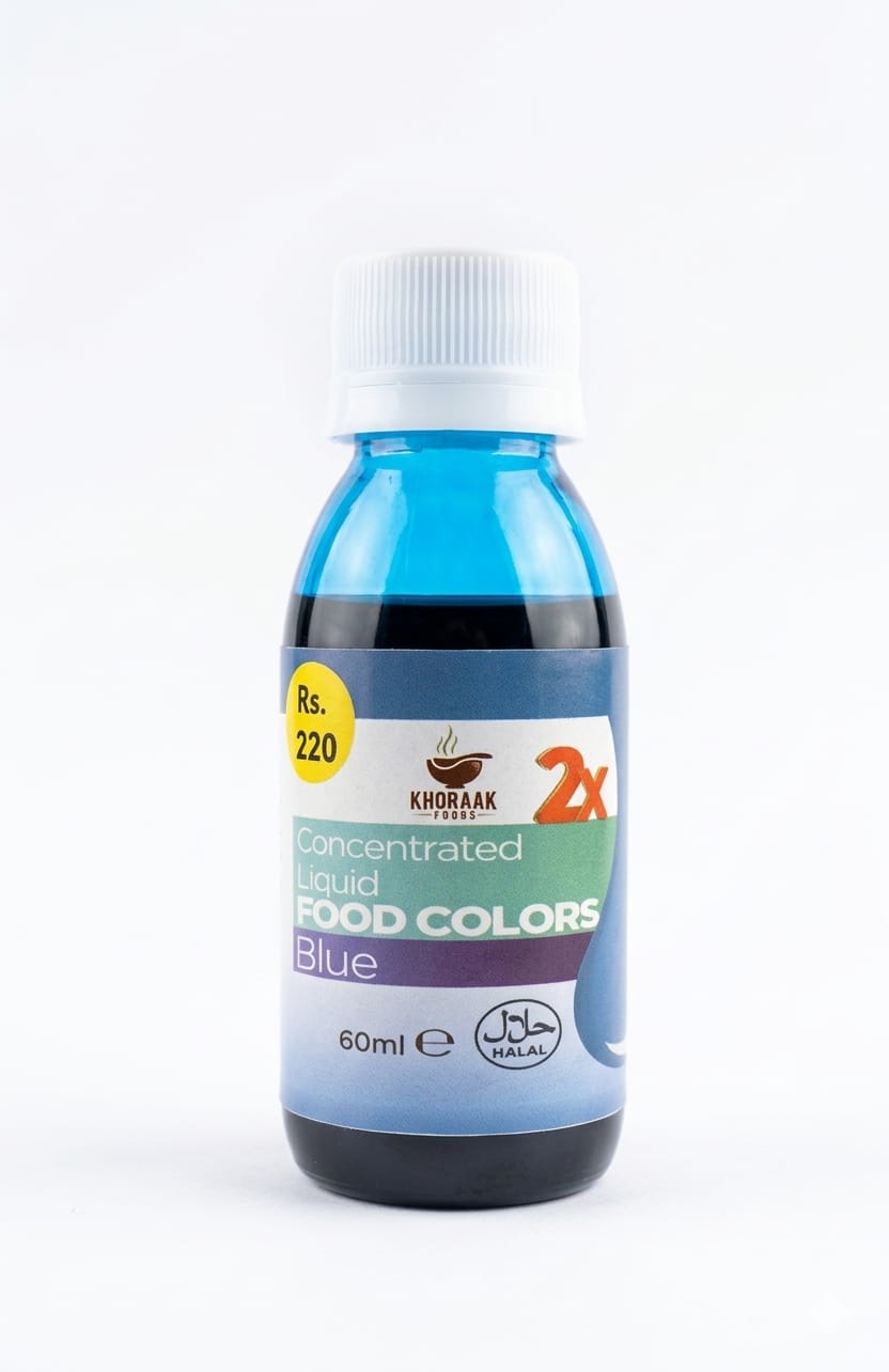 Add vibrant color to your dishes with Blue Food Color 60ml by Khoraak Foods. Food-safe liquid color in a convenient dropper bottle for baking, zarda, and desserts.