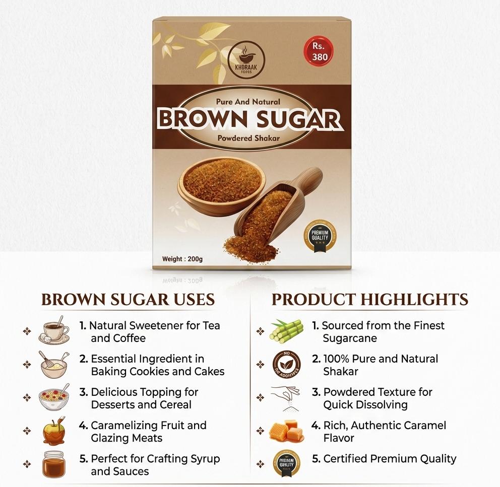 Add natural sweetness and rich flavor to your recipes with Khoraak Foods Brown Sugar (Shakar) Box 200g, a premium-quality sugar that delivers a soft texture and deep caramel taste. Unlike regular white sugar, this brown sugar contains natural molasses, which enhances flavor and also improves moisture in baked goods.