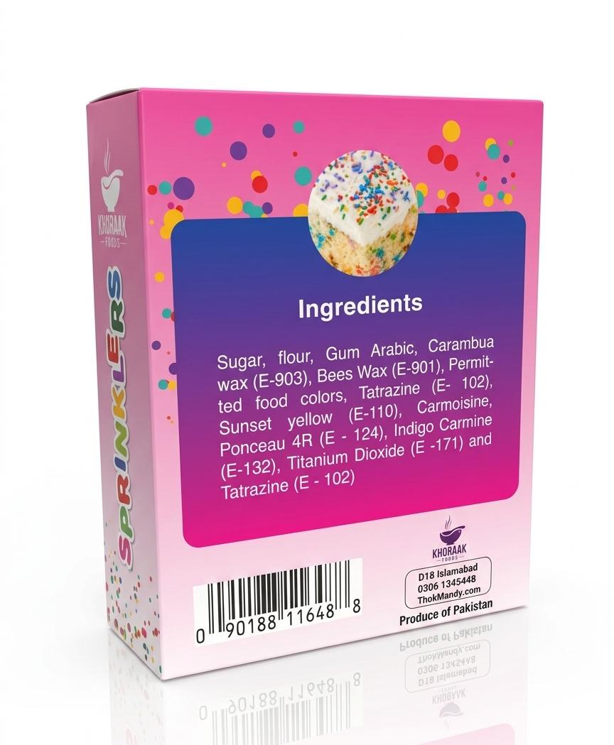 Khoraak Foods Cake Decoration Sprinklers are colorful and premium-quality sprinkles perfect for decorating cakes, cupcakes, cookies, and desserts. Moreover, they add vibrant color and texture. Therefore, they are ideal for baking at home or professional use.