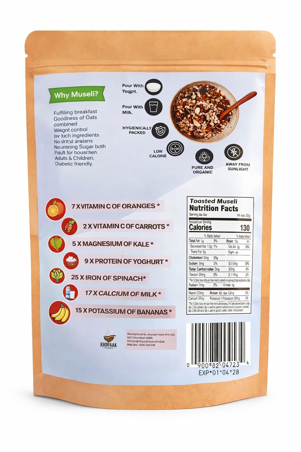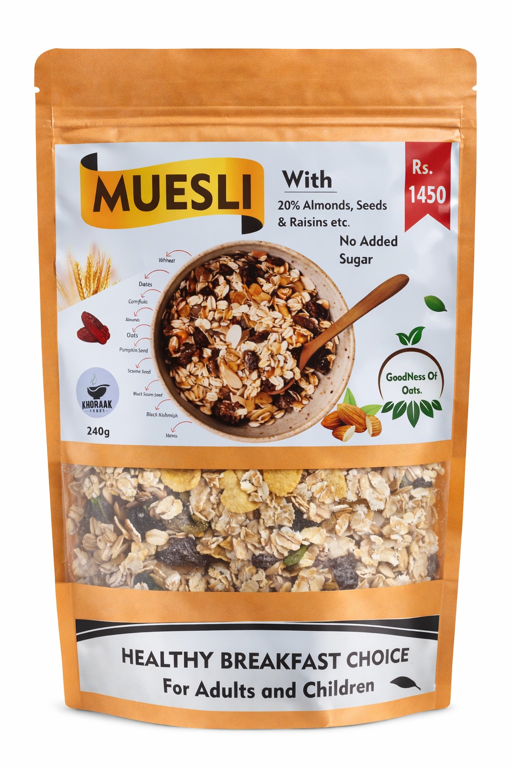 Fruit & Nut Muesli by Khoraak Foods combines oats, nuts, and dried fruits. Moreover, it serves as premium fruit nut muesli that delivers both nutrition and taste. As a result, it is widely used by health-conscious individuals.