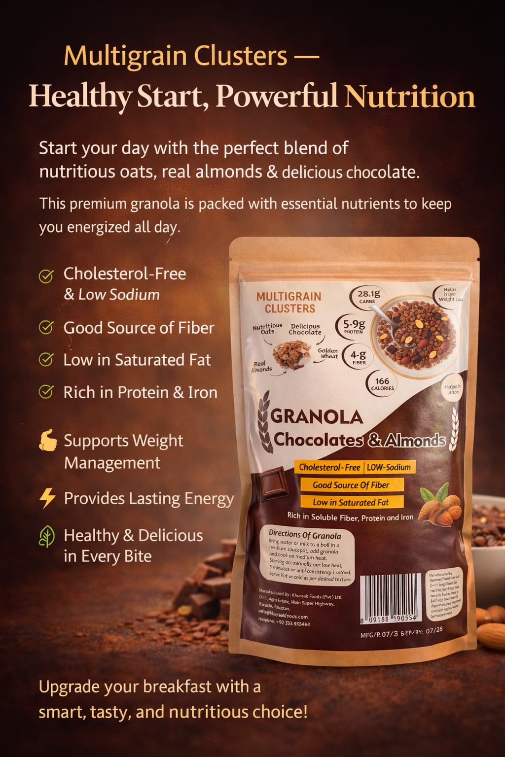 Our granola cereal combines the natural goodness of whole grain oats with the nutty taste of almonds and the indulgent sweetness of chocolate. The crunchy texture makes it enjoyable whether served with milk, yogurt, or eaten as a snack.