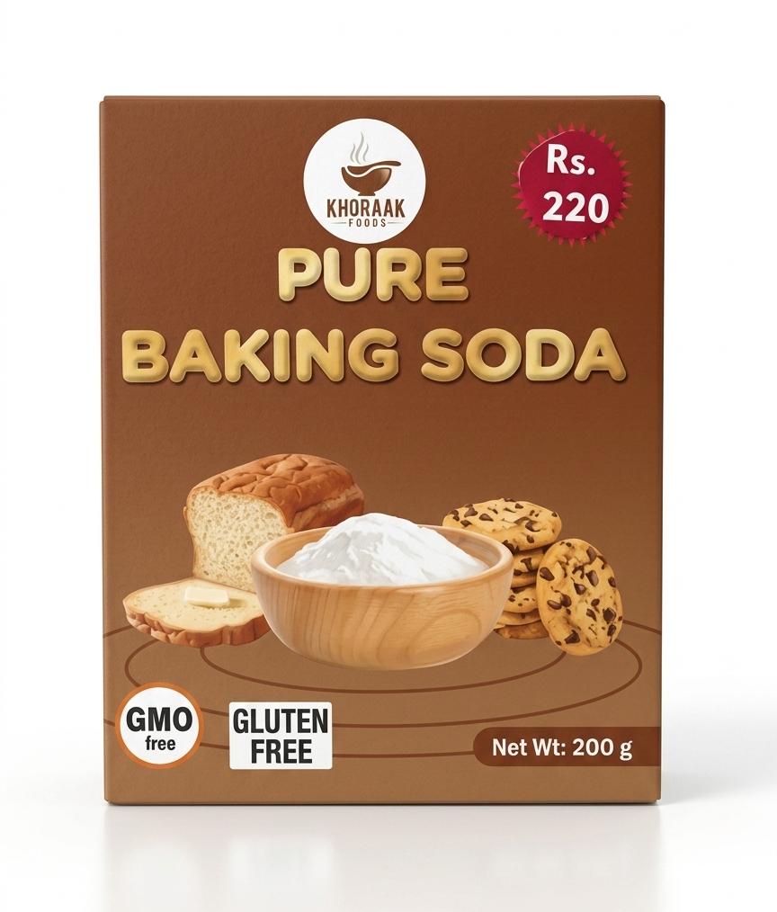 Khoraak Foods Baking Soda (Meetha Soda) 200g is a premium quality product for baking, cooking, and cleaning. It ensures soft cakes and perfect results every time.