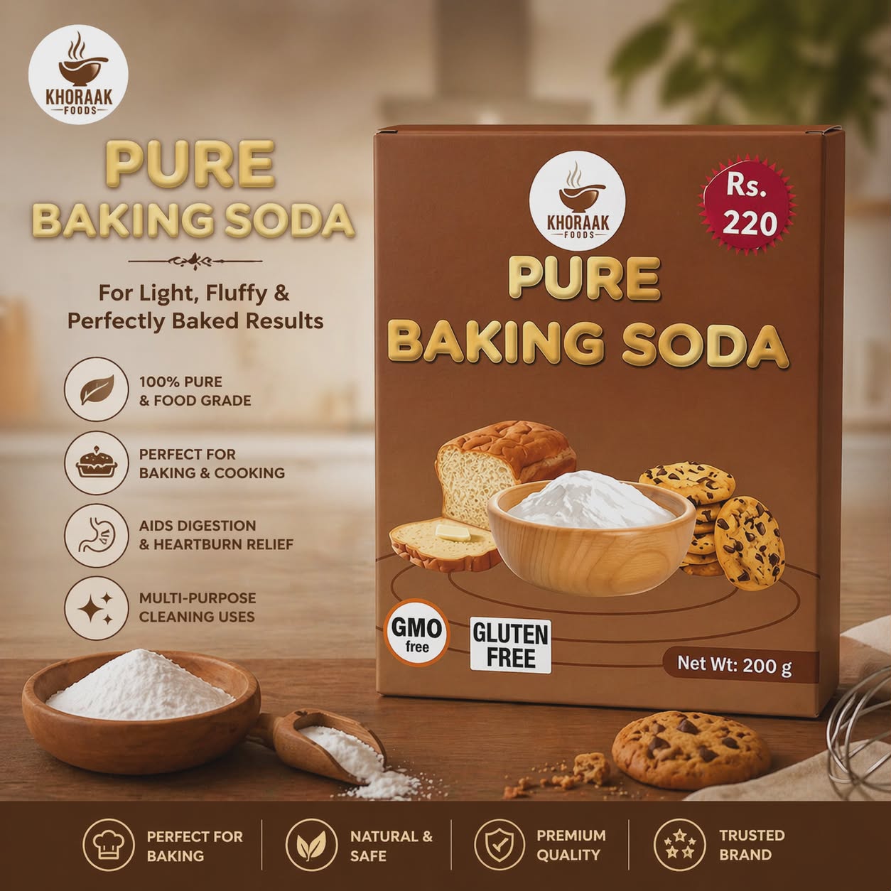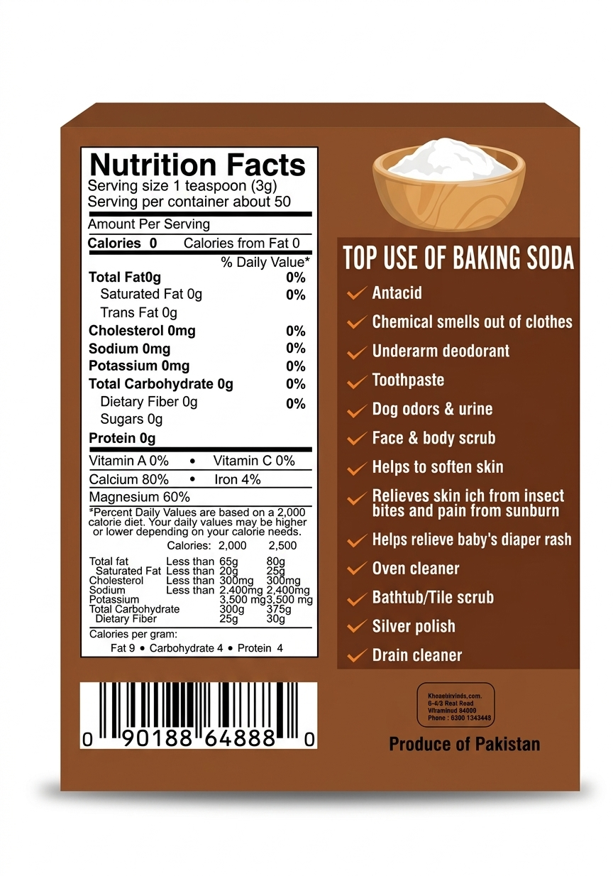 Khoraak Foods meetha soda offers premium quality for baking, cooking, and daily use. In other words, this baking soda delivers consistent results whether you bake cakes or prepare traditional dishes. Moreover, it works as a powerful ingredient for both kitchen and cleaning needs.