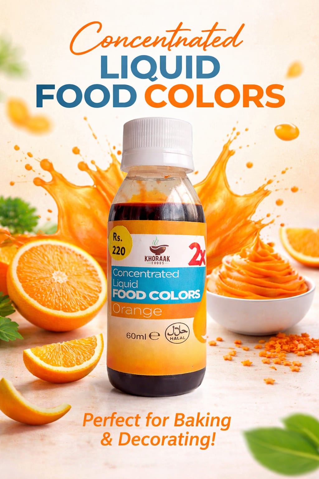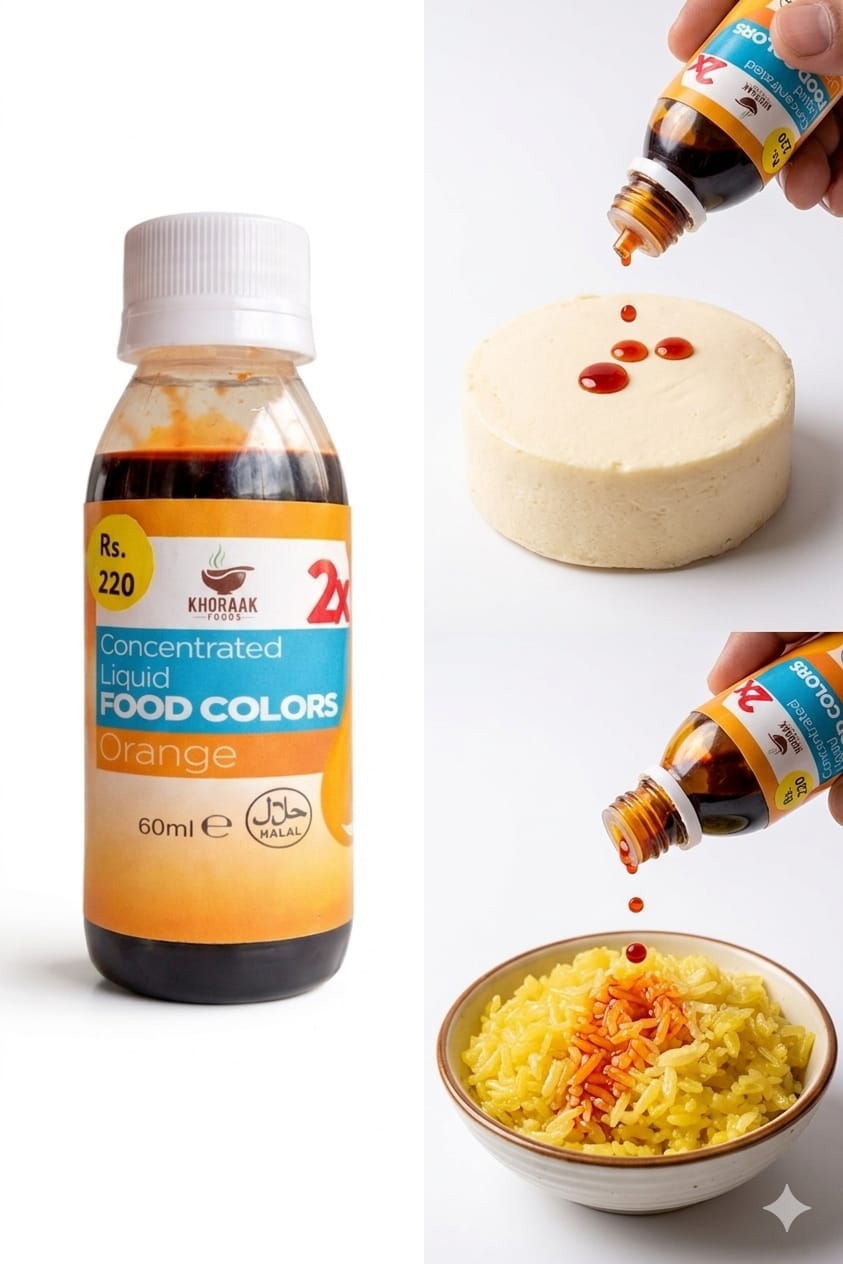 Khoraak Foods offers high-quality orange food color designed for daily cooking and baking. This concentrated liquid provides a bright and appealing orange shade. It blends easily into recipes and spreads evenly. Therefore, you achieve consistent color in every dish.