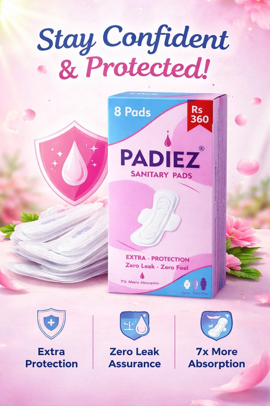 Padiez Sanitary Pads – 8 Pieces Box, Soft & Comfortable, Extra Absorbent, Leak-Proof, Feminine Care